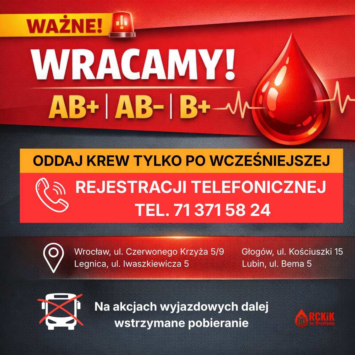 Akcje wyjazdowe: Na terenowych akcjach wyjazdowych pobieranie krwi grup AB+, AB- oraz B+ pozostaje nadal wstrzymane do odwołania.