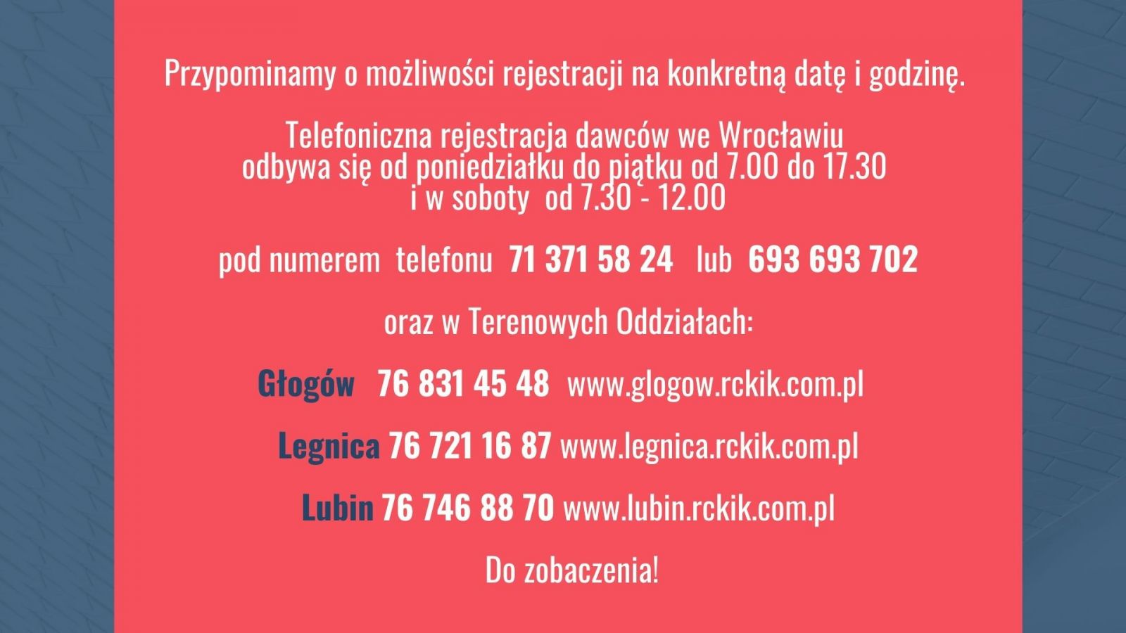 1. trosce o bezpieczeństwo oraz komfort wszystkich osób przebywających w naszym Centrum, uprzejmie prosimy, aby nie przyprowadzać dzieci do Regionalnego Centrum Krwiodawstwa i Krwiolecznictwa we Wrocławiu, ani na akcje wyjazdowe.