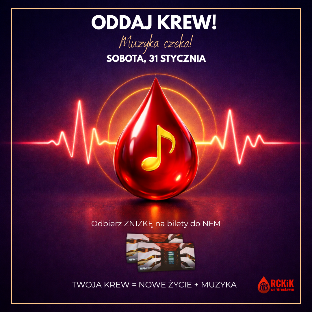 Wielka gratka dla miłośników muzyki! Już w najbliższą sobotę (31 stycznia) podczas oddawania krwi będziemy rozdawać specjalne kupony zniżkowe do Narodowego Forum Muzyki.