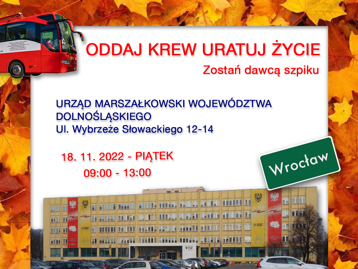 15.11.2022 » Akcja krwiodawstwa przed Urzędem Marszałkowskim Województwa Dolnośląskiego - 18.11.2022 r.