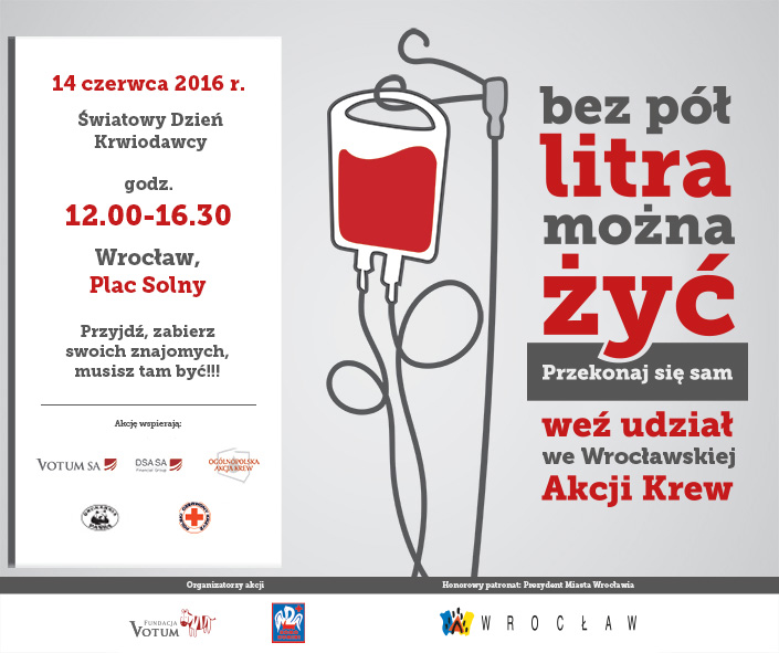 W tym roku, we współpracy z Fundacją VOTUM, uczcimy Święto Krwiodawców organizując akcję krwiodawstwa na Placu Solym we Wrocławiu. Godziny rejestracji dawców: 12.00-16.30.