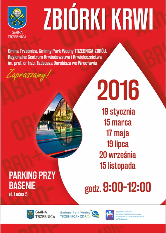 Regionalne Centrum Krwiodawstwa i Krwiolecznictwa im. prof. dr hab. Tadeusza Dorobisza we Wrocławiu oraz Gmina Trzebnica i Gminny Park Wodny TRZEBNICA-ZDRÓJ serdecznie zapraszają wszystkich chętnych do oddawania krwi. Akcje odbywają się w mobilnym punkcie poboru krwi na parkingu przy basenie.