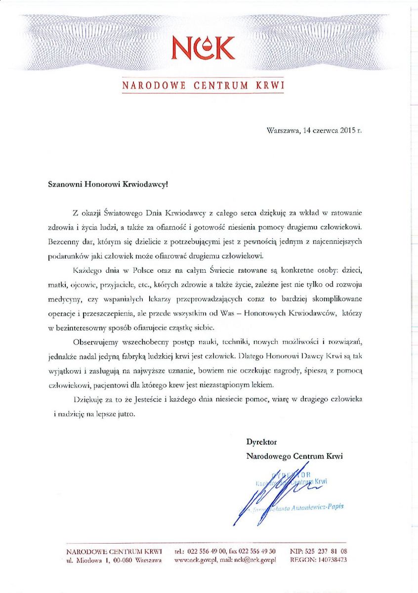 13.06.2015 » Dyrektor Narodowego Centrum Krwi z okazji Światowego Dnia Krwiodawcy