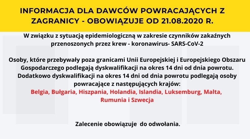 31.08.2020 » Informacja dla dawców powracających z zagranicy