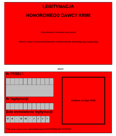 Uprzejmie informujemy, że zgodnie z Rozporządzeniem Ministra Zdrowia z dnia 11 września 2017 roku w sprawie wzorów odznak i legitymacji wydawanych w związku z honorowym dawstwem krwi, obowiązuje nowy wzór Legitymacji Honorowego Dawcy Krwi: http://isap.sejm.gov.pl/isap.nsf/DocDetails.xsp?id=WDU20170001742