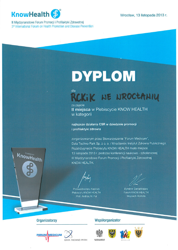 Z wielką przyjemnością i radością informujemy, że w dniu 13 listopada br. podczas Plebiscytu III Międzynarodowego Forum Promocji i Profilaktyki Zdrowotnej Know Health 2013, nasze Centrum zajęło II miejsce w kategorii "Najlepsze działania CSR w dziedzinie promocji i profilaktyki zdrowia"