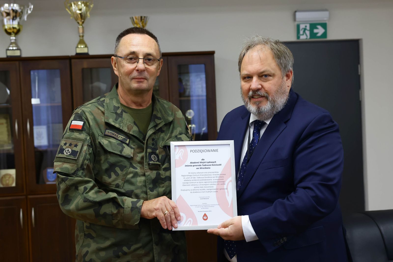 Wczoraj Dyrektor Regionalne Centrum Krwiodawstwa i Krwiolecznictwa we Wrocławiu Pan Jacek Blicharski złożył na ręce Rektora Akademia Wojsk Lądowych imienia generała Tadeusza Kościuszki gen. broni w st. spocz. dr Marka Tomaszyckiego serdeczne podziękowania za wspieranie naszego Centrum w stanie zagrożenia powodziowego. Obecność żołnierzy z 23 kompanii szkolnej i ich wielka pomoc były nieocenione. Dziękujemy za włożony wysiłek, zaangażowanie i gotowość do działania w tym trudnym czasie.