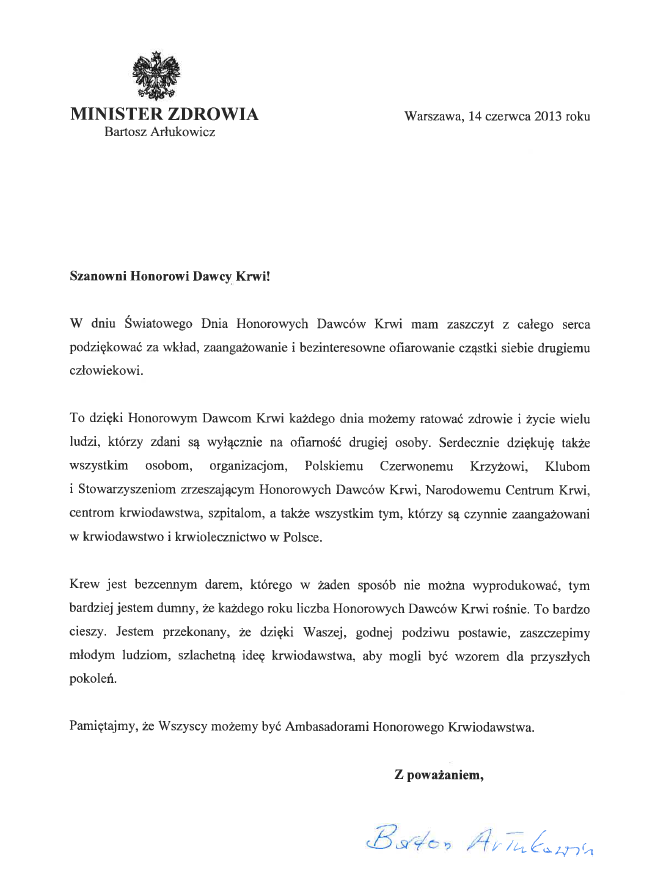14.06.2013 » Szanowni Honorowi Dawcy Krwi!