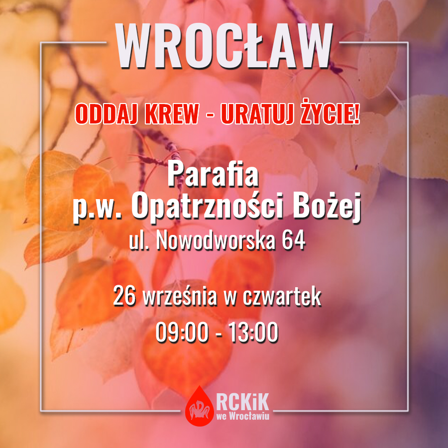 26.09.2024 » Uwaga! W czwartek będziemy również pobierać krew na Nowym Dworze we Wrocławiu