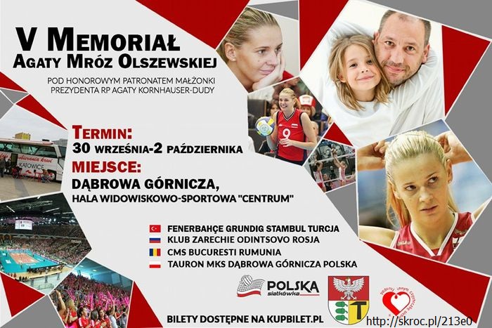 W imieniu Fundacji Kropla Życia im. Agaty Mróz-Olszewskiej oraz organizatorów wydarzenia zapraszamy na V Memoriał Agaty Mróz-Olszewskiej, który odbędzie się w dniach 30 września - 2 października 2016 r. w Hali Widowiskowo-Sportowej "Centrum" w Dąbrowie Górniczej.