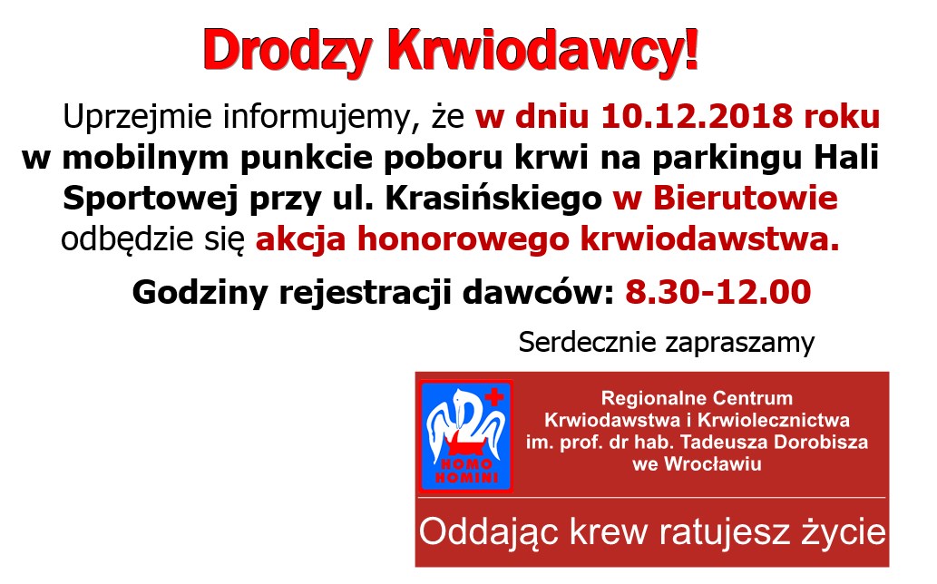 07.12.2018 » Zapraszamy na akcję krwiodawstwa do Bierutowa - 10.12.2018 r.