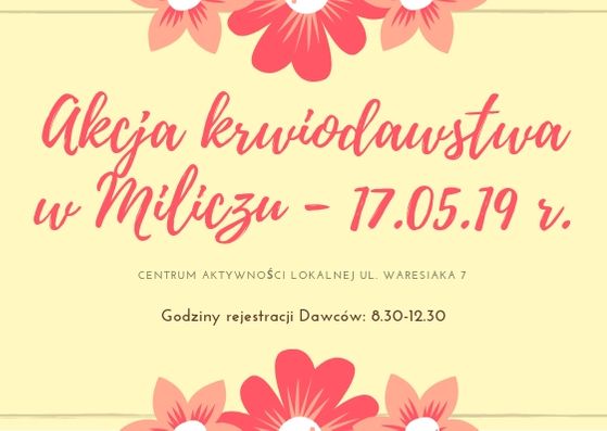 16.05.2019 » Zapraszamy na akcję krwiodawstwa do Milicza - 17.05.2019 r.