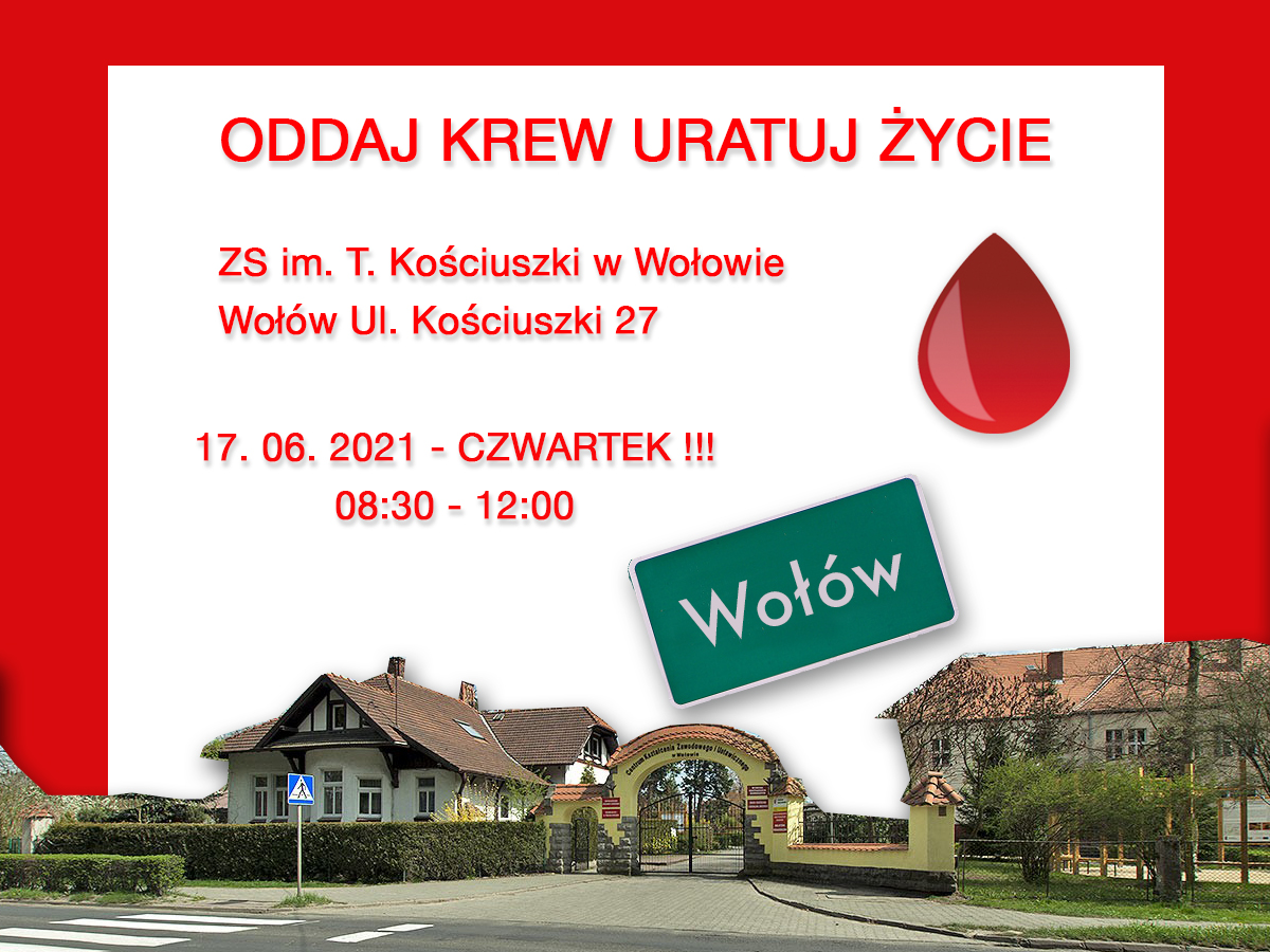 15.06.2021 » Zapraszamy na akcje krwiodawstwa do Wołowa - 17.06.2021 r.