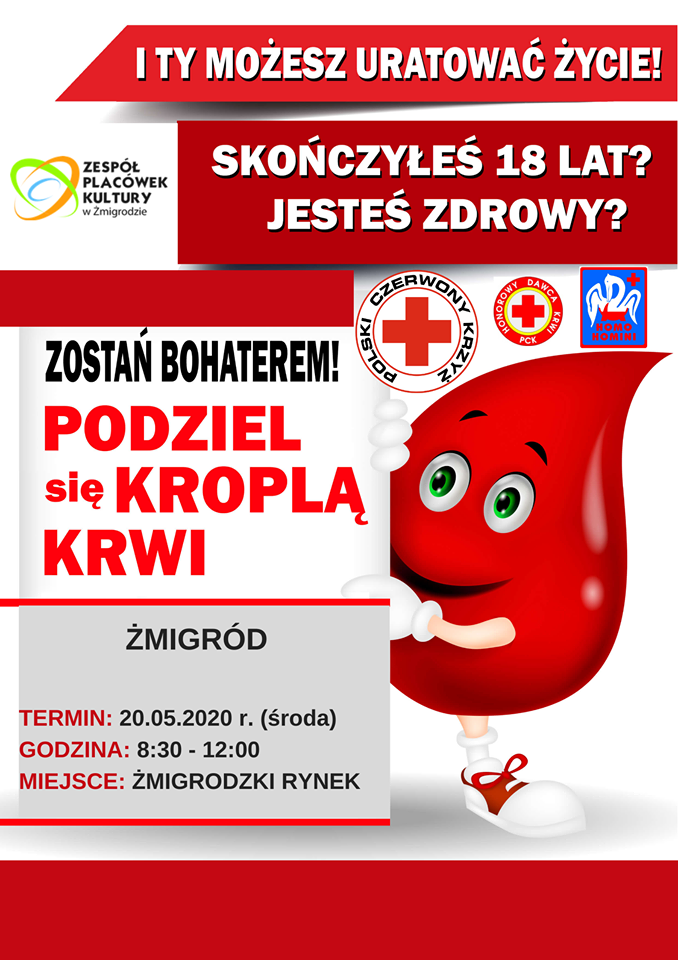 19.05.2020 » Zapraszamy na akcje krwiodawstwa do Żmigrodu - 20.05.2020 r.