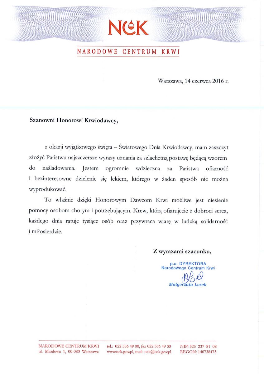 14.06.2016 » Życzenia Dyrektora Narodowego Centrum Krwi