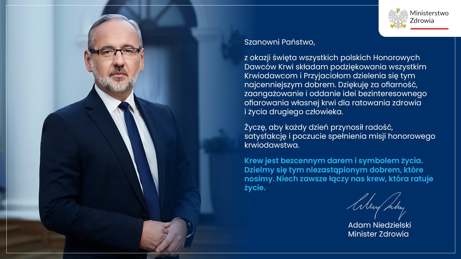 22.11.2022 » Życzenia Ministra Zdrowia Adama Niedzielskiego dla Honorowych Dawców Krwi.