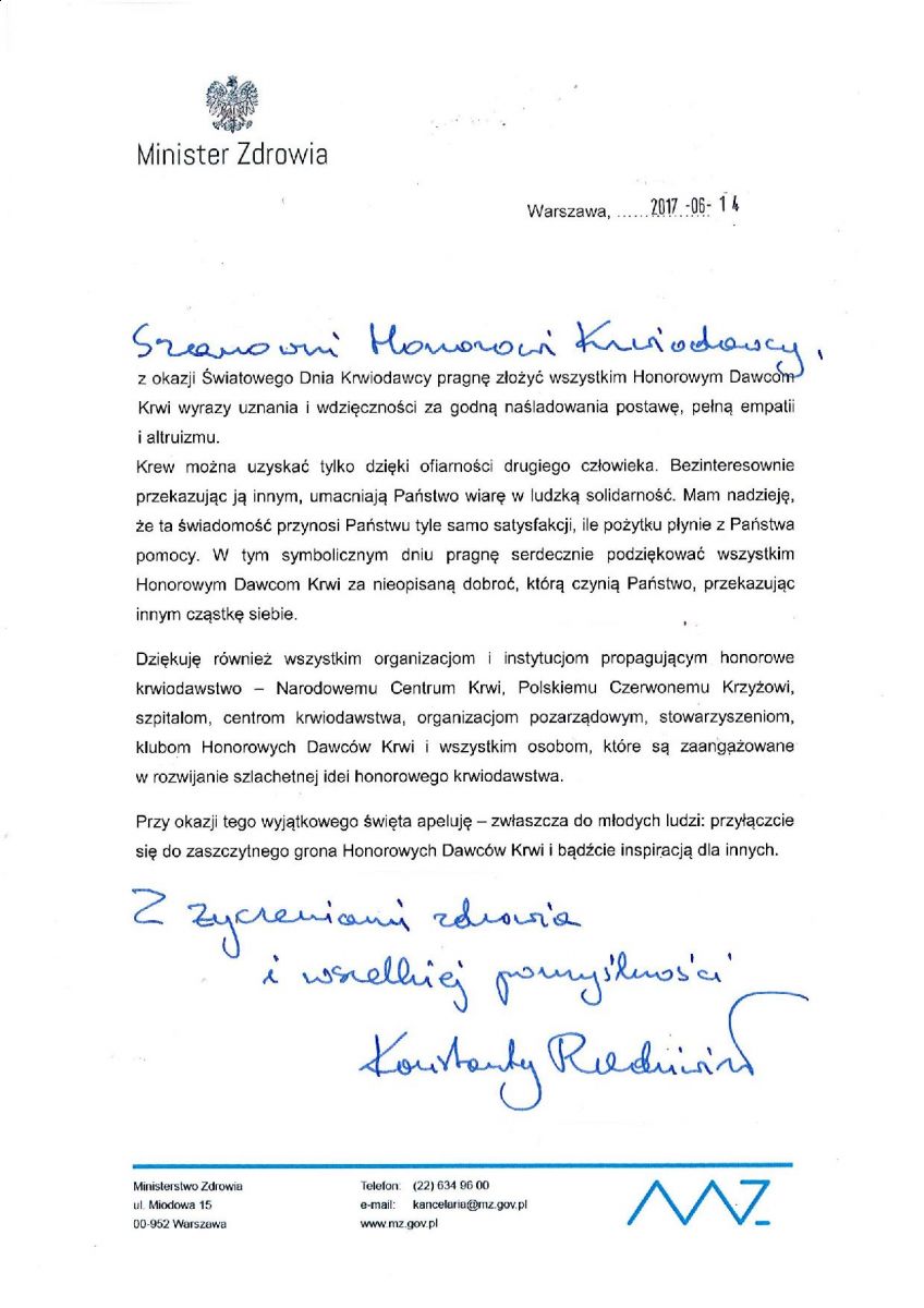 14.06.2017 » Życzenia Ministra Zdrowia z okazji Światowego Dnia Krwiodawcy