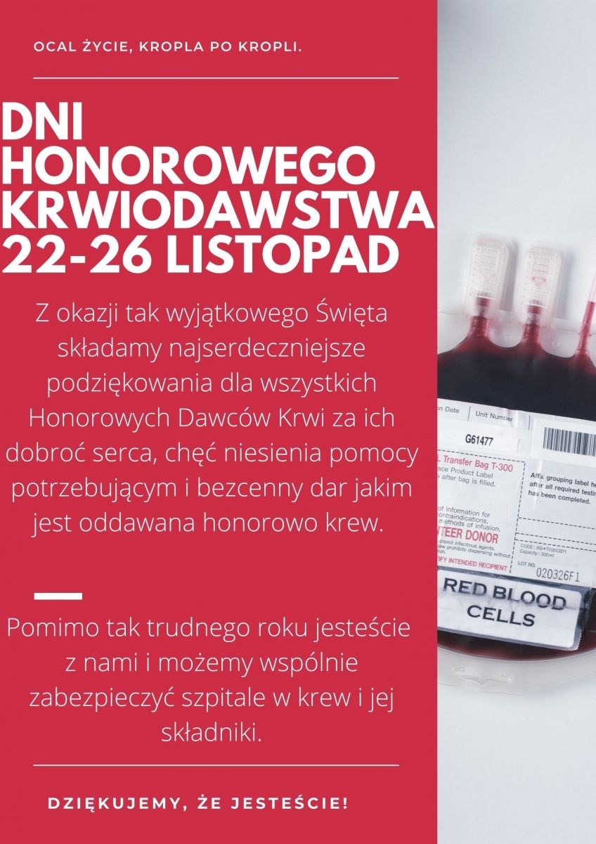 22.11.2020 » Życzenia z Okazji Dni Honorowego Krwiodawstwa PCK, które obchodzimy w dniach 22-26 listopada