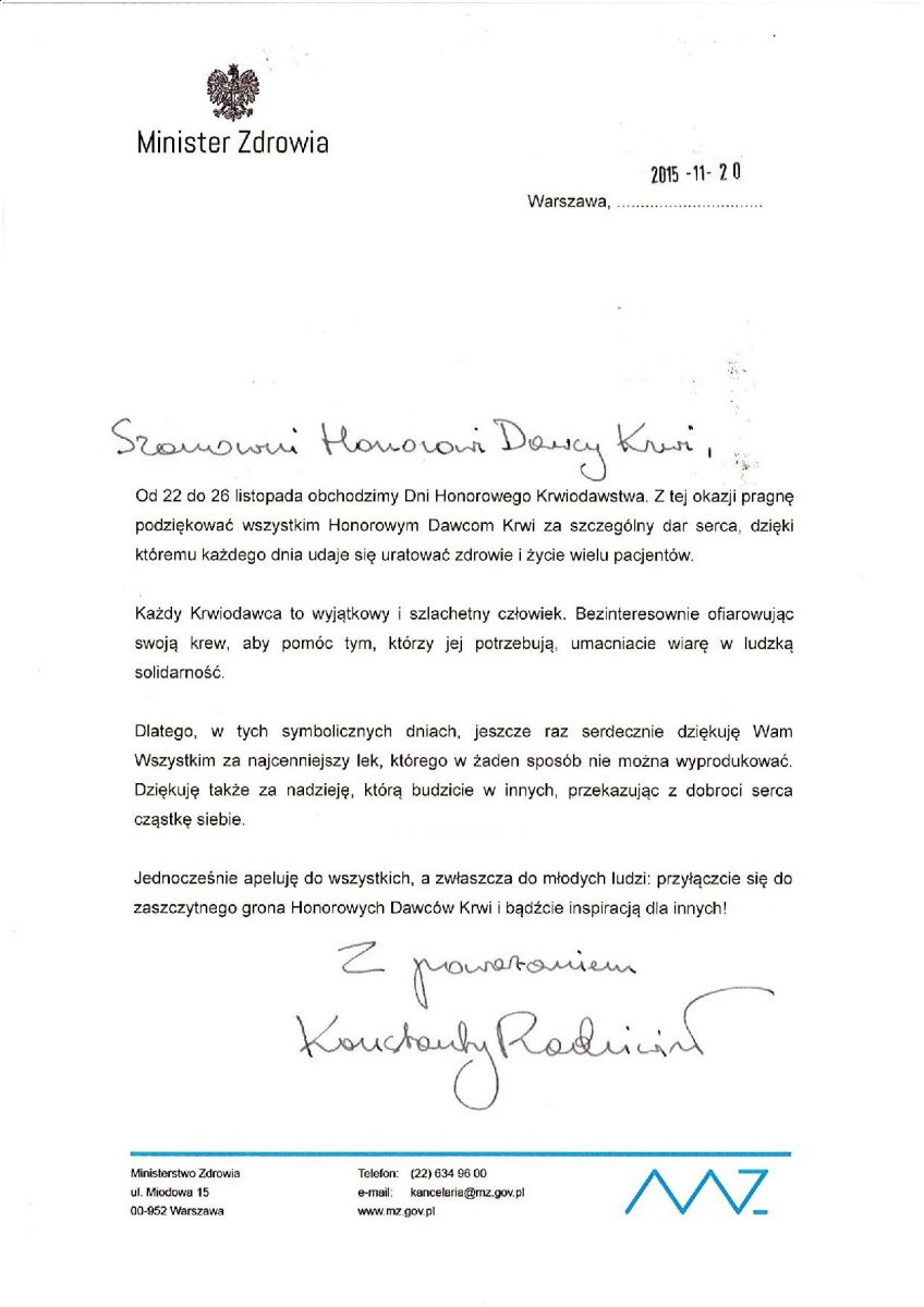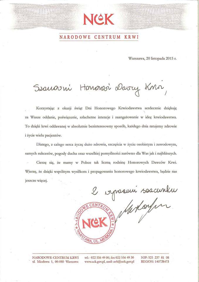 21.11.2015 » Życzenia z okazji Dni Honorowego Krwiodawstwa PCK