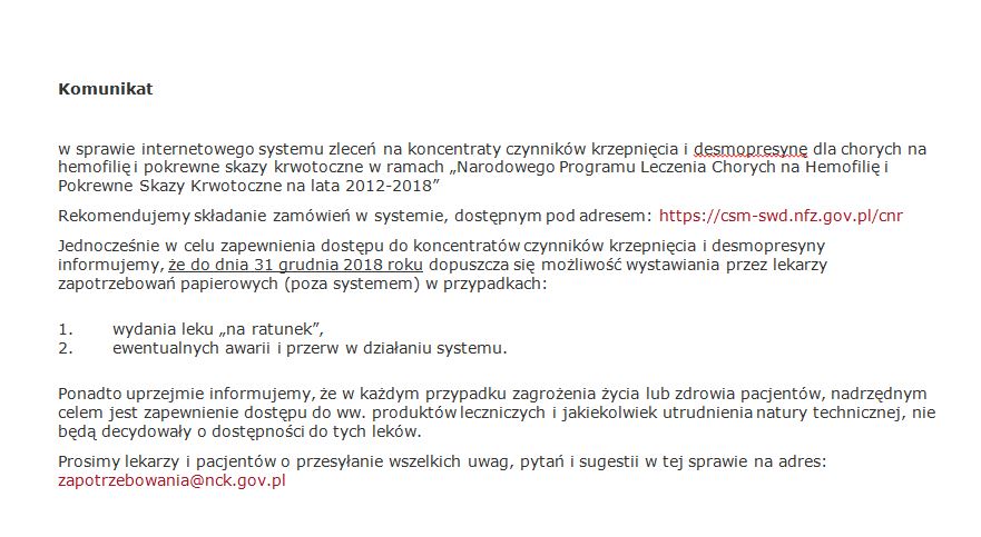 Koncentrat zespołu protrombiny powinien być dostępny w każdym podmiocie leczniczym. Jednocześnie informujemy, że RCKiK we Wrocławiu dysponuje w/w czynnikami wyłącznie dla pacjentów objętych "Narodowym Programem Leczenia Chorych na Hemofilię i Pokrewne Skazy Krwotoczne na lata 2019 - 2023" .