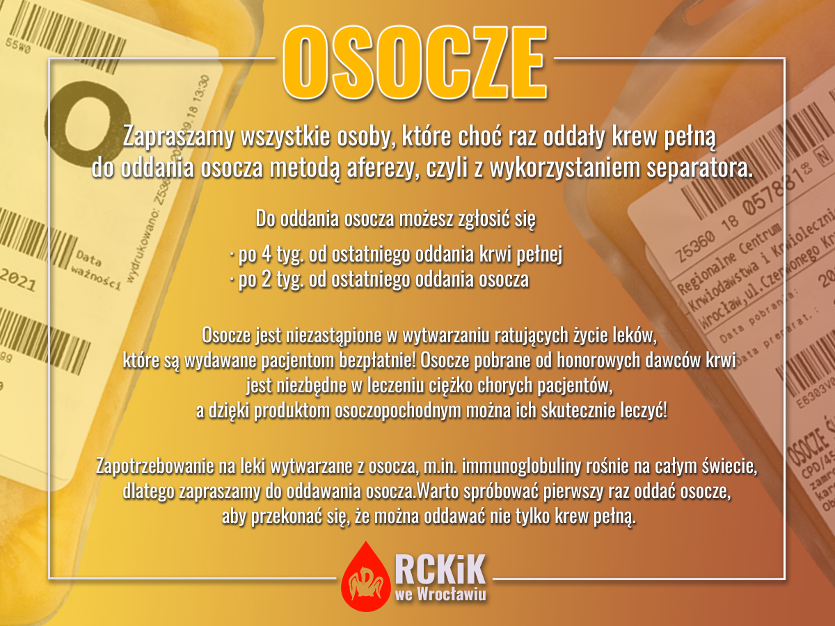 Osocze można oddać w RCKIK we Wrocławiu oraz naszych Terenowych Oddziałach w Głogowie, Legnicy i Lubinie.
