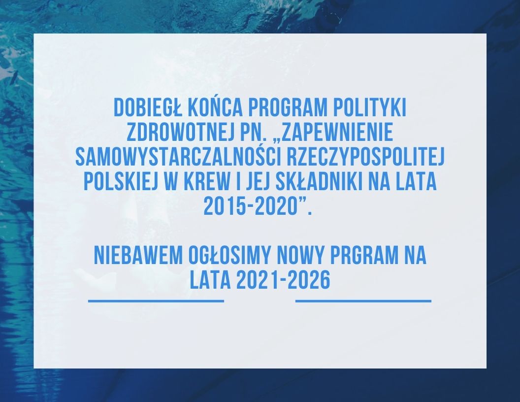 Dobiegł końca program polityki zdrowotnej pn. „Zapewnienie samowystarczalności Rzeczypospolitej Polskiej w krew i jej składniki na lata 2015-2020”. Niebawem ogłosimy nowy prgram na lata 2021-2026 a tymczasem informujemy, że